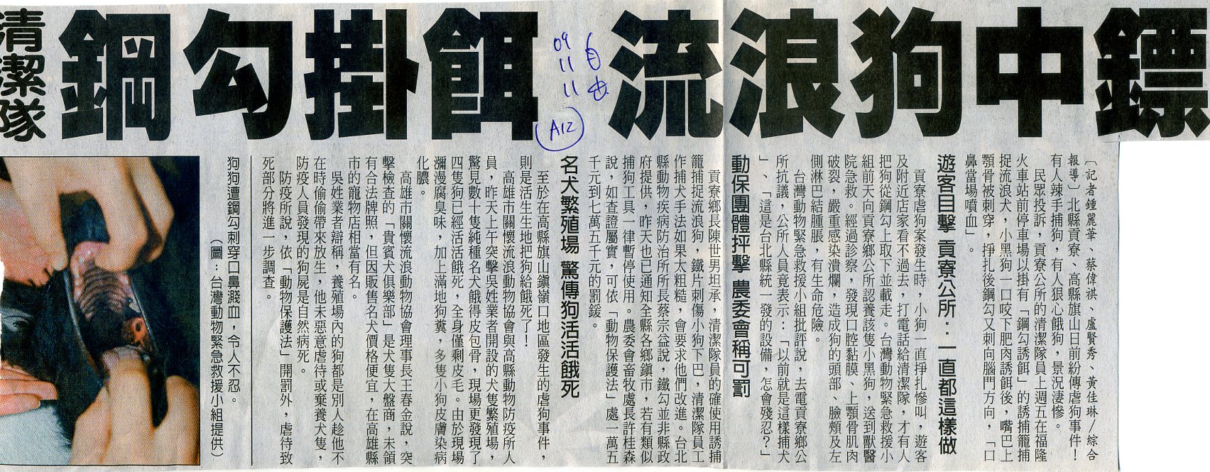 案由:98年11月6日,報載台北縣貢寮鄉清潔隊在福隆火車站前停車場,以鋼勾掛餌誘捕籠捕捉流浪動物,致一流浪犬咬下肥肉誘餌後,刺穿上顎骨。(