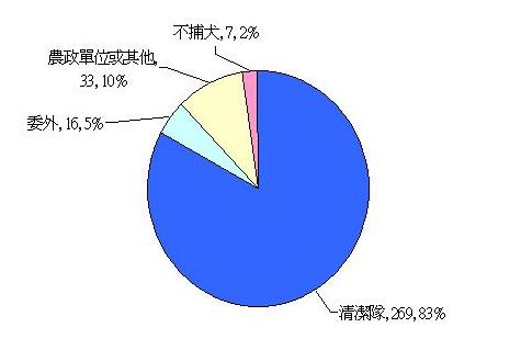 民國90年(2001),行政院決議將捕犬業務的中央主管機關,由環保署移轉至農委會,但地方捕犬業務則授權地方首長決定由環保或農政單位負責,目前約有7個縣市是由地方農政單位主管捕犬業務。但據本會訪查,全國設有捕犬單位的318個鄉鎮市中,269個鄉鎮(83%)是由「清潔隊」負責捕犬,另有16個鄉鎮(5%)將捕犬業務委外,其他33個鄉鎮則是由縣防疫所、農政課、環保課……負責。亦即,全台有八成三的鄉鎮市是由清理、清運垃圾的清潔隊負責「捕捉」流浪狗。【圖三】 |